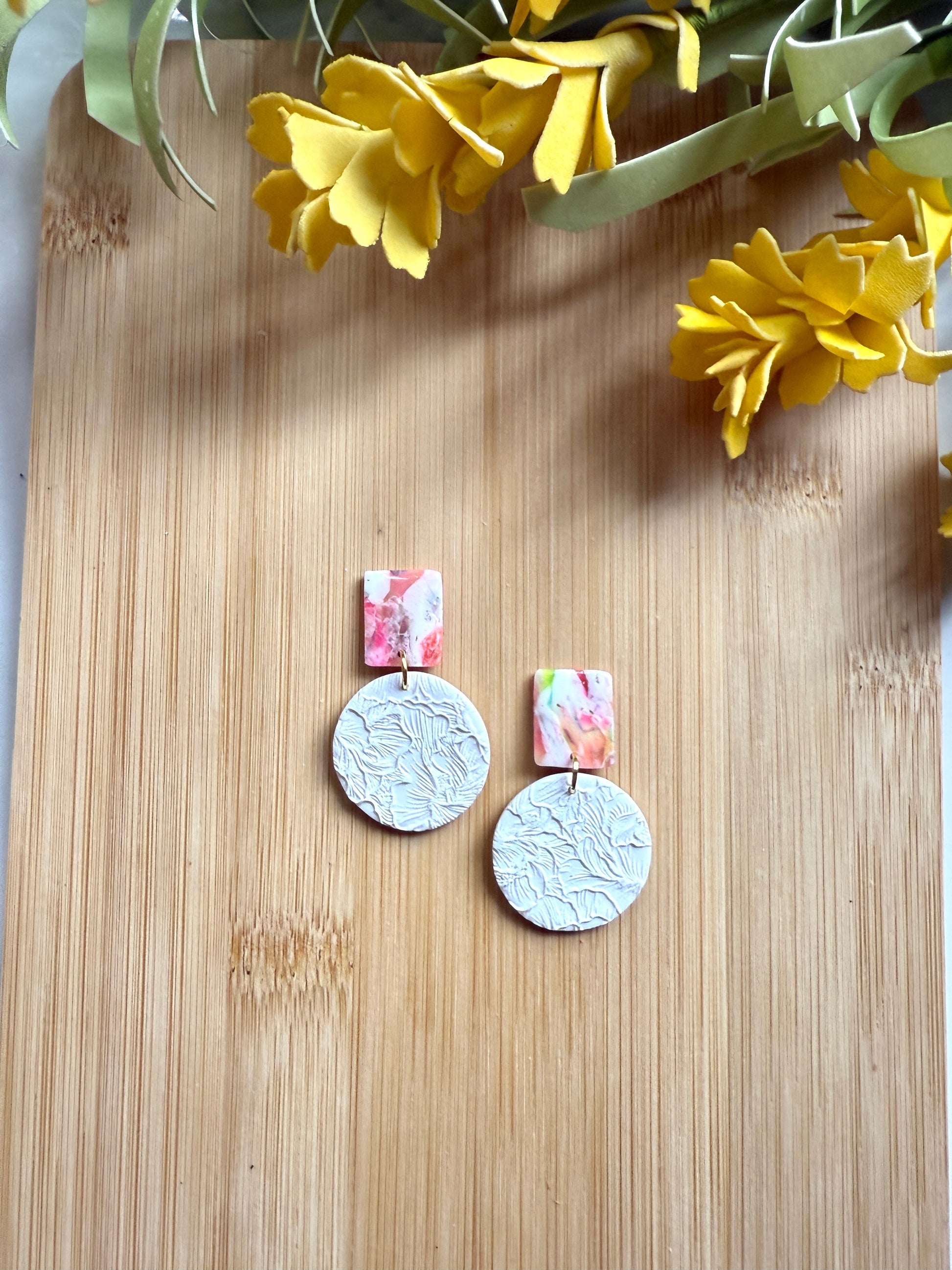 White bottom with floral imprint, multi colored and sealed with resin stud